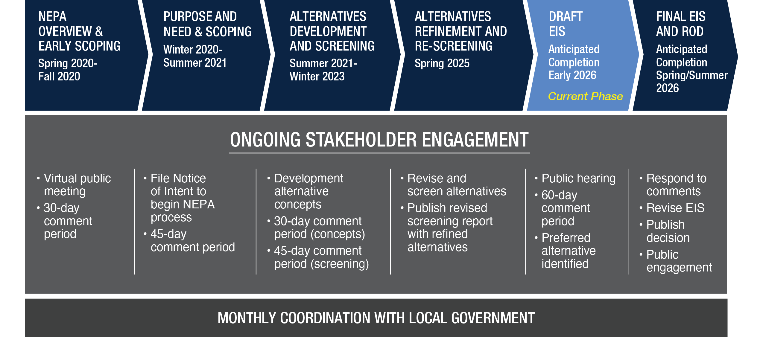 Recent activities include updates to local councils and responding to stakeholder questions. Ongoing efforts focus on evaluating project alternatives in depth, identifying the preferred alternative, completing final technical reviews, and compiling the Draft EIS. Monthly meetings with local governments continue. After receiving feedback from the community, we have decided to release the Draft EIS in January following the holiday season. The community will be invited to review and comment on the Draft EIS once it is published in the new year.
